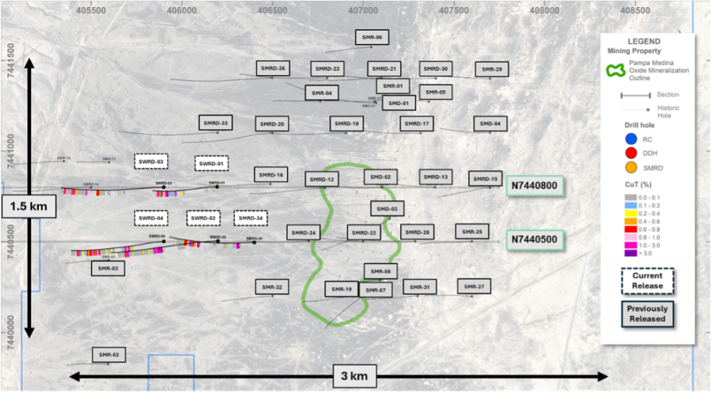 “Pampa Medina continues to demonstrate remarkable consistency of grade and thicknesses across the currently defined area of interest. The Phase II program was predominantly 300m-spaced grid-based drilling intended to define the extent of the mineralized system in which we are yet to define the limits. The 2026 program will focus on definition drilling of the identified high-grade corridors between sections N7,441,100 and N7,440,500, as well as Pampa Medina Norte (SMD/SMR-01) in both oxides and sulphides, as well as continued large-scale step-outs to test regional continuity of the favourable host rocks. Our exploration model is strengthening at Pampa and we look forward to updating the market with our evolving interpretations of the manto-system ahead of the Phase III program in 2026.