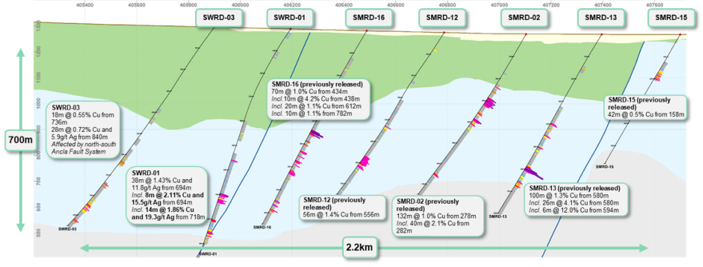 - SWRD-03 was affected by splays of the north-south Ancla Fault System zone and intersected lower-grade deep mineralization