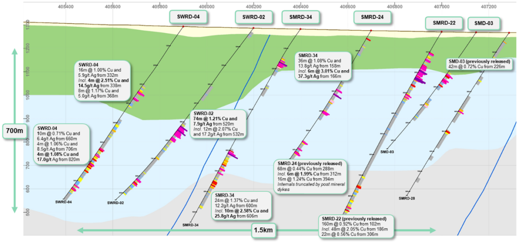 - SMRD-34, drilled in between SWRD-02 and SMRD-24 on a 300m spacing, intersected mineralization in both the near-surface upper volcanics and the lower sediments
